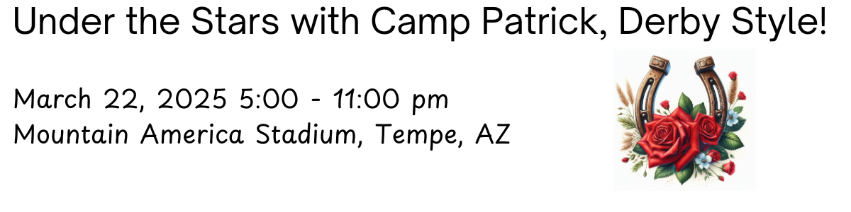 Get ready to don your finest derby attire and join Camp Patrick for A Derby Night to Remember! This unforgettable evening combines the elegance and excitement of the Kentucky Derby with the heart of Camp Patrick's mission. Guests will experience all the classic derby traditions-from stunning hats and stylish outfits to the thrill of the "Run for the Roses"-while supporting an incredible cause.