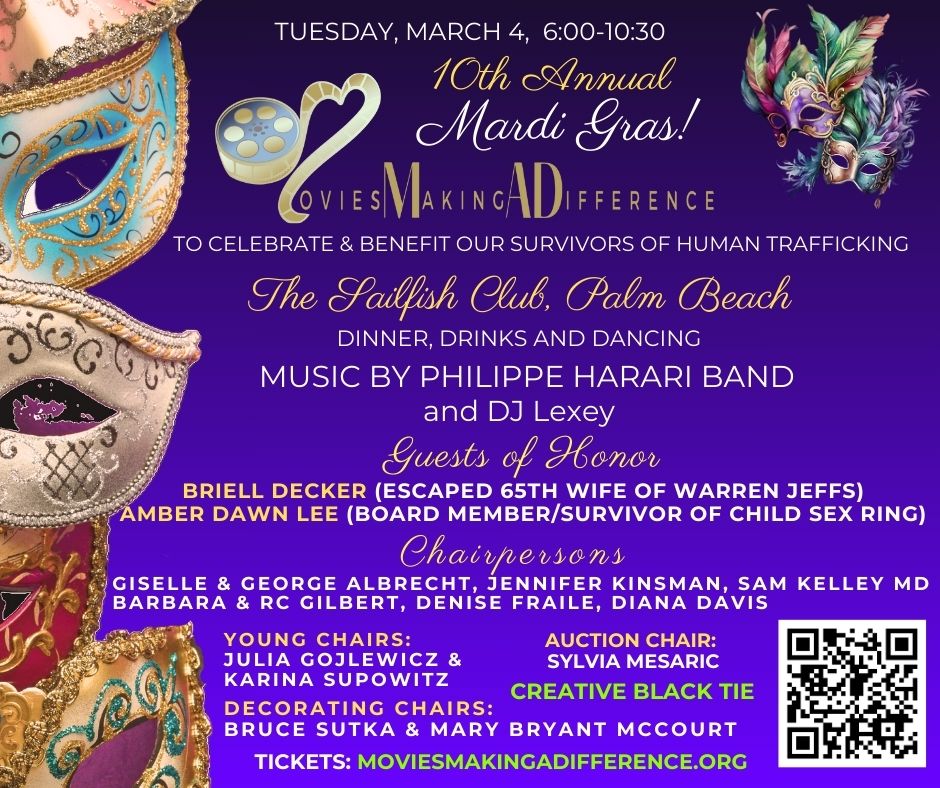 A perfect setting at the beautiful Sailfish Club along the Intercoastal on Palm Beach Island. Use your creativity to dress in your Mardi Gras best to help us Benefit and Celebrate our Survivors of Human Trafficking.You'll be kicking off a lively evening with fabulous DJ Lexey on electric violin during a festive cocktail reception with light bites and silent auction.